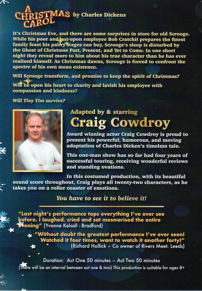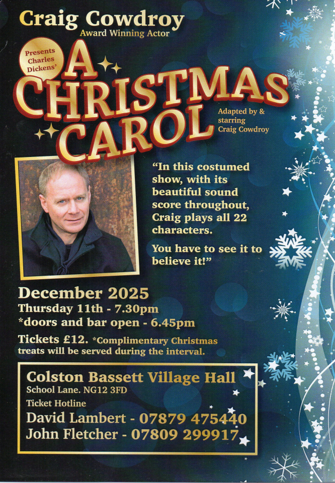 We are pleased to inform you that the village hall will be staging ‘A Christmas Carol’, a one-man show performed by award-winning actor Craig Cowdray, on Thursday 11th December 2025 at 7:30pm. The performance has received very good reviews. Tickets are priced at £12.00, and complimentary Christmas treats will be served during the interval. If you are interested in purchasing tickets, please contact either David Lambert on 07879 475440 or John Fletcher on 07809 299917.